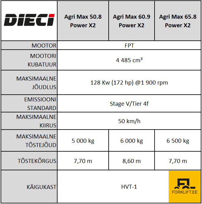 Dieci Agri Max Power X2 on saadaval kolme mudelina: 50.8, 60.9 ja 65.8. Esimene number tähistab tõstevõimet: 5-6,5 tonni ning teine maksimaalset tõstekõrgust: 8-9 meetrit.